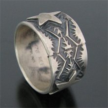 | 数多くの賞を獲得しているNAVAJO/ナバホ族の人気アーティスト Sunshine Reeves/サンシャイン・リーブスに制作依頼をしたリングです。 スタンプワークの名手だけあって奥深いスタンプが巧みにリング全体に施されており、その上にThree Star(スリースター)を組み合わせて頂きました。 まるでアンティークジュエリーのように仕上げられた、サンシャイン特有のオールドスタイル、ナバホの王道スタイルを充分に堪能できるリングです。 インディアンジュエリーを始めて着ける方にも安心してお使い頂け、シンプルでスタイリングがしやすく、 長年お使い頂くと味わい深い作品になります。 | ||
