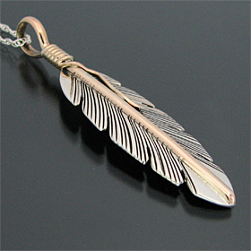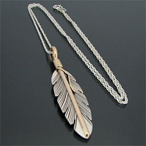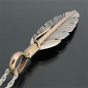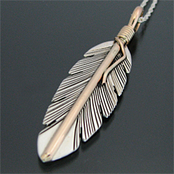 | NAVAJO/ナバホ族の人気アーティスト Harvey Mace/ハーヴィー・メイスに制作依頼をした、イーグルフェザーモチーフのネックレスです。 フェザーのモチーフに、センターの芯部分には12KGF(12金張り)が施されている、とても高級感の感じられる作品に仕上がっています。 フェザーのモチーフで有名なベテランアーティストで、躍動感の溢れるフェザーは、シンプルでバランス良くお使い頂けるアイテムです。 流行に流されないすっきりとしたシンプルなデザインは、男女問わず幅広い層から支持を得ています。 シルバーとゴールドのコンビはスタイリングが締まります。 | ||