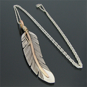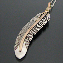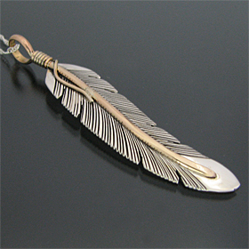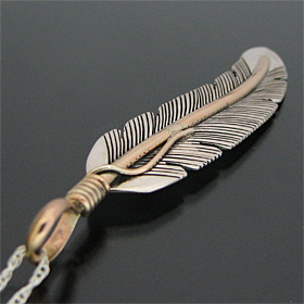 | NAVAJO/ナバホ族の人気アーティスト Harvey Mace/ハーヴィー・メイスに制作依頼をした、イーグルフェザーモチーフのネックレスです。 フェザーのモチーフに、センターの芯部分には12KGF(12金張り)が施されている、とても高級感の感じられる作品に仕上がっています。 フェザーのモチーフで有名なベテランアーティストで、躍動感の溢れるフェザーは、シンプルでバランス良くお使い頂けるアイテムです。 流行に流されないすっきりとしたシンプルなデザインは、男女問わず幅広い層から支持を得ています。 シルバーとゴールドのコンビはスタイリングが締まります。 | ||