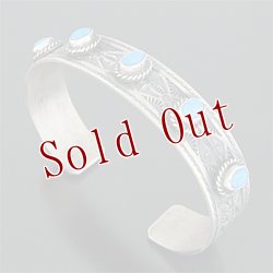 | NAVAJO/ナバホ族のアーティスト Derrick Gordon/デリック・ゴードンに制作依頼をしたバングルです。 地金は艶消しのアンティーク調に仕上げ、ナバホの伝統的な柄をスタンプ用いてを全体に入れて頂きました。 5個のスリーピングビューティー(ターコイズ)をセットし、これぞナバホジュエリーという大胆で、クラシックなスタイルに仕上がっています。 使用してからの風合いを楽しんで頂きたい作品です。 13mm幅のスタイリングしやすい幅ですので、さりげなくインディアンジュエリーをアピールする事が出来るアイテムです。 ※サイズは多少変更が出来ますので、お気軽にお問い合わせくださいませ。 | ||