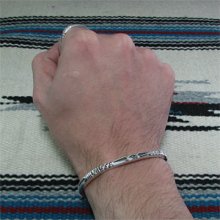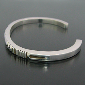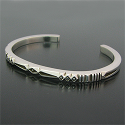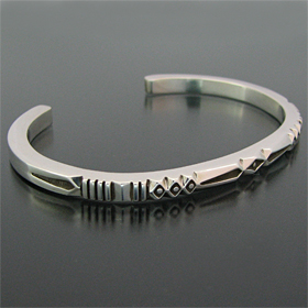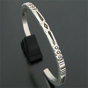 | NAVAJO/ナバホ族の女性アーティスト Jennifer Curtis/ジェニファー・カーティスに制作を依頼したバングルです。 肉厚のシルバーに、深く正確なスタンプワークが施されており、多面的な造形を作り出すエッチング技法を取り入れた、彼女の代表的作品になります。 4mm幅のシンプルな作品ですが、一つ一つのスタンプには力強さが感じられ、女性アーティストならではの緻密で繊細な作品です。 着けやすさはもちろん、重ね付けにも最適なアイテムで、シンプルにさりげなくインディアンジュエリーをアピールする事が出来ます。 | ||