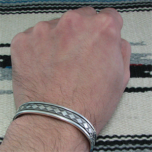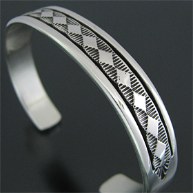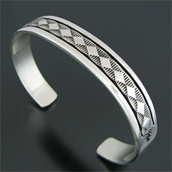 | NAVAJO/ナバホ族のアーティスト Bruce Morgan/ブルース・モーガンに制作を依頼したバングルです。 シンプルながらも深く正確なスタンプ、年齢やスタイルを問わない彼の作品は、幅広い層から支持を得ています。 緻密で規則的なナバホ族の伝統的デザインが施されており、シンプルに着けたい方など、インディアンジュエリーをさりげなくアピールすることが出来る作品です。 重厚感のある2mm厚、しっかりとした着け心地がり、末永くご愛用して頂ける飽きの来ないアイテムです。 | ||