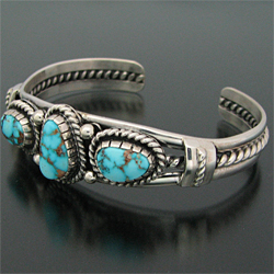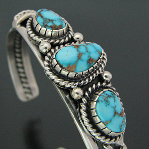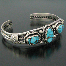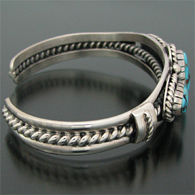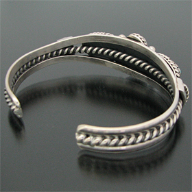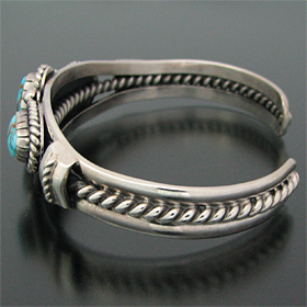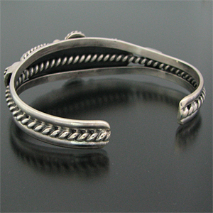 | 兄であるWill Vandever共に人気兄弟です。NAVAJO/ナバホ族のアーティスト Delbert Vandever/デルバート・バンデバーが制作したバングルです。 上質のキングマンが3つセットされている重厚感のある作品です。センターには彼の代名詞でもあるツイストワイヤーが用いられています。 厚みもしっかりとしており、シャイニー仕上げのとても上品で着け応えのある作品です。 | ||
