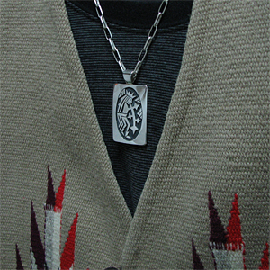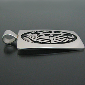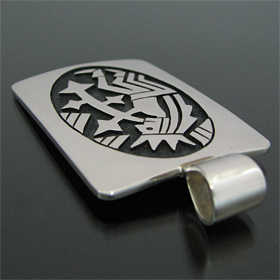 | HOPI/ホピ族の有名アーティスト Ricky Coochwytewa/リッキー・クーチュワイテワに制作依頼をしたペンダントです。 オーバーレイ技法を用いて、【スターブロワーズ】がデザインされています。 こちらは偉大な父親であるヴィクターから継承されているデザインで、ヴィクターは1994年にアリゾナ州の人間国宝にも選ばれています。 自身でデザインした作品と共に、近年特に父親のヴィクターのデザインも使用した作品を制作しており、当店ではリッキーと深い親交があるため、スターブロワーズの金型を譲って頂いています。 こちらの金型は店頭でご紹介させて頂いております。 こちらは直接リッキーに制作依頼した物で、スクエア型の存在感あるサイズに仕上がっています。 味わい深いホピチェーンと組み合わせるのがお勧めです。 | ||