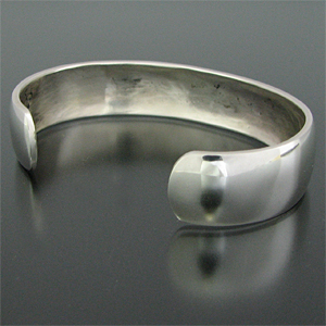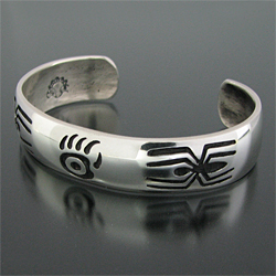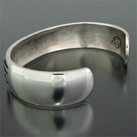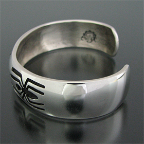 | HOPI/ホピ族のベテランアーティスト Anderson Koinva/アンダーソン・コインヴァが制作したバングルです。 オーバーレイを用いて、センターに勇気と力の象徴でもあるベアパウ、両サイドにはスパイダーがデザインされています。 しなやかなアールがかったフォルムに洗練されたデザイン、ホピのオールドスタイルがお楽しみ頂けるアイテムです。 厚みのあるゲージしようしているため重厚感が感じられ、素朴なデザインですが味わい深い作品に仕上がっています。 シンプルなデザインほど高い技術力が必要ですが、カットの技術力はもちろんの事、画像ではお伝え出来にくいですが温かみのあるフォルムは、古きスタイルが巧みに表現されている逸品だと思います。 また、作家の技量が作品によく反映されています。 サイズ調整も可能ですので、お気軽にご相談ください。 | ||
