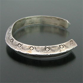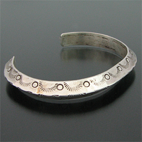 | TAOS/タオス プエブロの有名アーティスト Sonny Spruce/ソニー・スプルースの代表作、三角ワイヤーを使用したバングルです。 ソニーが得意とするスタンプワークが施されている、とてもシンプルでスタイリングしやすい作品です。 ベーシックなデザインですが、いつもインディアンジュエリーを身に着けていたい方には最適なバングルだと思います。 アンティークのような風合いを演出する彼の作品は、飽きの来ない長く使って頂けるアイテムです。 | ||