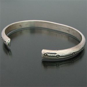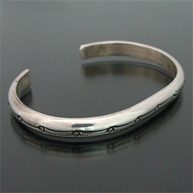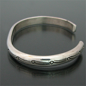 | TAOS/タオス プエブロの有名アーティスト Sonny Spruce/ソニー・スプルースの代表作、甲丸ワイヤーを使用したバングルです。 ソニーが得意とするスタンプワークが施されている、とてもシンプルでスタイリングしやすい作品です。 ベーシックなデザインですが、いつもインディアンジュエリーを身に着けていたい方には最適なバングルだと思います。 アンティークのような風合いを演出する彼の作品は、飽きの来ない長く使って頂けるアイテムです。 | ||