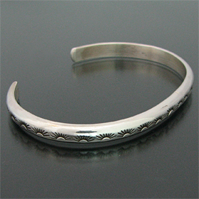 | TAOS/タオス プエブロの有名アーティスト Sonny Spruce/ソニー・スプルースの代表作、甲丸ワイヤーを使用したバングルです。 ソニーが得意とするスタンプワークが施されている、とてもシンプルでスタイリングしやすい作品です。 ベーシックなデザインですが、いつもインディアンジュエリーを身に着けていたい方には最適なバングルだと思います。 アンティークのような風合いを演出する彼の作品は、飽きの来ない長く使って頂けるアイテムです。 | ||