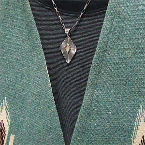 | NAVAJO/ナバホ族の女性アーティスト Pat Bedonie/パット(パトリシア)・べドニーに制作を依頼をしたペンダントです。 彼女の代表的デザインのサンバースト(太陽光線)をモチーフに、14K&シルバーを使用したコンビペンダントです。 中心部分がシルバーと14Kのダブルダイヤモンドになっています。 彼女が制作するジュエリーはどれも高級感があり、妥協のない綺麗な作品を手掛けています。 正確で丁寧且つシャープなスタンプワークは、女性がスタンプしたとは思えない様な力強いスタンプですが、女性アーティストだからできる繊細さも持ち合わせた作品です。 洗練されたデザインですが、ナバホ族の伝統的なデザインです。 ホピチェーン・ナバホチェーンと組み合わせるのがお勧めです。 | ||