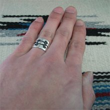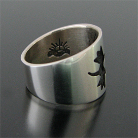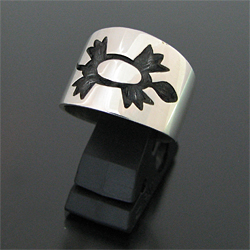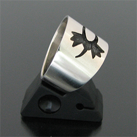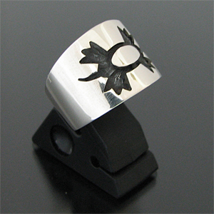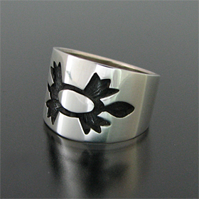 | HOPI/ホピ族のベテランアーティスト Anderson Koinva/アンダーソン・コインヴァに制作を依頼をしたリングです。 オーバーレイ技法を用いて、【タートル】のデザインが施されています。 タートルは大地に見立てた甲羅を背負って歩く姿から母なる大地の象徴と言われており、その他に雨をもたらすなど、祖先との絆を結ぶものとしての意味があります。 デザインはタートルのみのシンプルなデザインですが、鏡面仕上げにする事によって、黒と銀のコントラストがしっかりと利いている作品に仕上がりました。 経年変化と共にホピジュエリー特有の味わい深いアイテムをお楽しみ下さい。 サイズ直しは名前刻印、デザインに影響なく可能です。 | ||