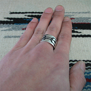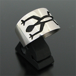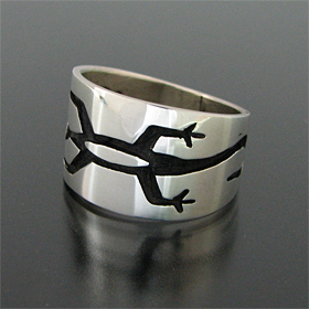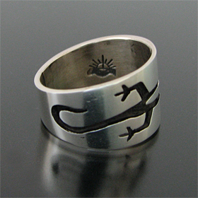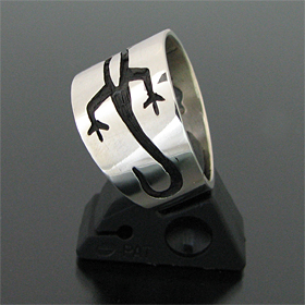 | HOPI/ホピ族のベテランアーティスト Anderson Koinva/アンダーソン・コインヴァに制作を依頼をしたリングです。 オーバーレイ技法を用いて、【リザード】のデザインが施されています。 リザードは知性の象徴であり、地上の全てを知り尽くす動物と言われています。 デザインはリザードのみのシンプルなデザインですが、鏡面仕上げにする事によって、黒と銀のコントラストがしっかりと利いている作品に仕上がりました。 経年変化と共にホピジュエリー特有の味わい深いアイテムをお楽しみ下さい。 サイズ直しは名前刻印、デザインに影響なく可能です。 | ||