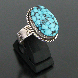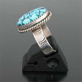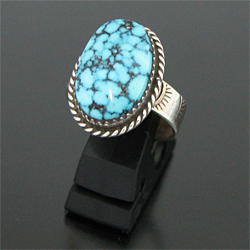 | TAOS/タオス プエブロのアーティスト Sonny Spruce/ソニー・スプルースがキングマンを用いて制作したリングです。 ベーシックなフォルムに、スカイブルーにブラックウェブが入ったキングマンがセットされています。 見た目以上に着けやすさが感じられ、素朴ながらも彼のスタイルがしっかりと作品には表れています。 男女問わずお楽しみ頂けます。 | ||