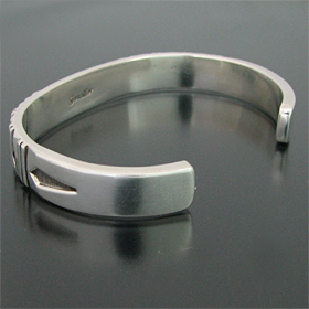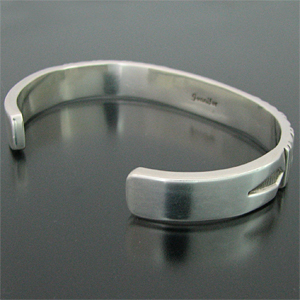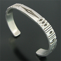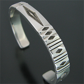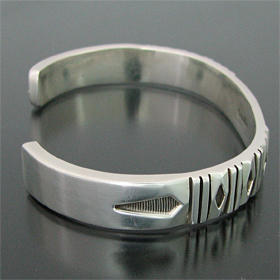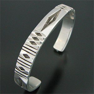 | NAVAJO/ナバホ族の女性アーティスト Jennifer Curtis/ジェニファー・カーティスに制作を依頼したバングルです。 肉厚のシルバーに、深く正確なスタンプが施されており、多面的な造形を作り出すエッチング技法を取り入れた、彼女の代表的作品になります。 シンプルでスタイリングのしやすい9mm幅、飽きの来ないデザインです。 父親から受け継いだ技術とスタイルの中に、女性らしさが兼ね備わった作品です。 | ||