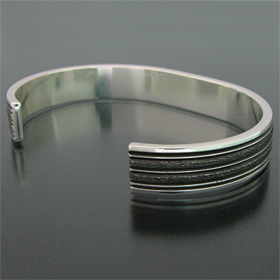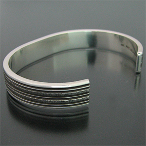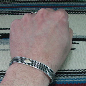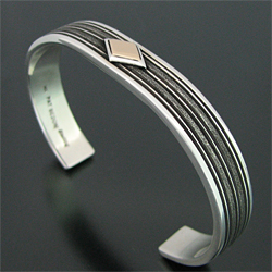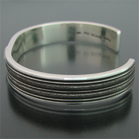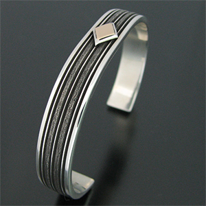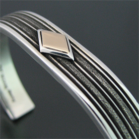 | NAVAJO/ナバホ族の女性アーティスト Patricia Bedonie/パトリシア・べドニーに制作依頼をしたバングルです。 鏡面に仕上げた部分と、表面に刻みを入れた黒のエングレービングをミックスさせた、リバーメールのオリジナルデザインになります。 シンプルですが、コントラストが際立つ作品に仕上がりました。 センターには14K&シルバーを組み合わせた、ダブルダイヤモンドになっています。 サイズ調整も可能ですので、お気軽にご相談ください。 | ||