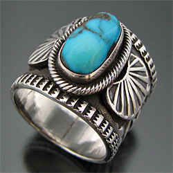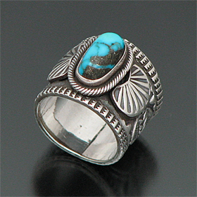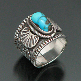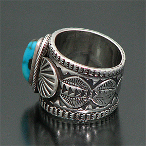 | 賞も獲得しているNAVAJO/ナバホ族の大人気アーティスト Gary Reeves/ゲーリー・リーブスが制作したリングです。 ゲーリー・リーブスが得意とするスタンプワークが巧みに施されており、ボリュームのあるスモーキービズビーが使用されています! ゲーリー・リーブスが制作するベーシックなデザインですが、淡いブルーのとてもキレイなスモーキービズビーがよりスタンプを引き立てています! スタンプワークで用いられる『たがね』は、たくさんの種類と数あり、一つ一つ組み合わせ方が異なるので、彼の作品には全く同じ模様と言うものが存在しないと言われています。 | ||