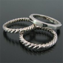 | NAVAJO/ナバホ族の女性アーティスト Jennifer Curtis/ジェニファー・カーティスに制作を依頼をしたリングです。 こちらはツイストの2点が加わった3連リングになります。3連・2連と様々な組み合わせ方がお楽しみ頂けます。 肉厚のシルバーに、深く正確なスタンプが施されており、多面的な造形を作り出すエッチング技法を取り入れた、彼女の代表的作品になります。 父親から受け継いだ技術とスタイルに、女性ならではの繊細さが加わった作品です。 | ||