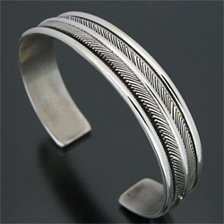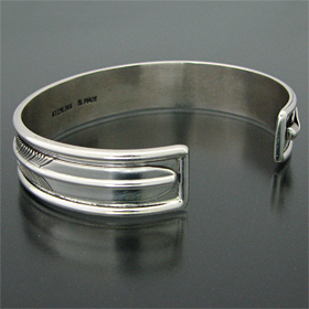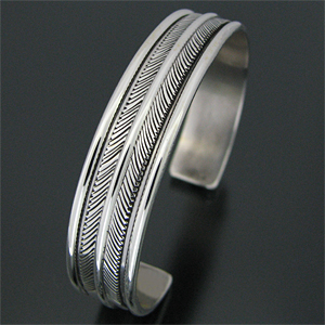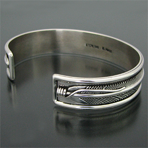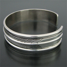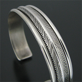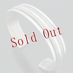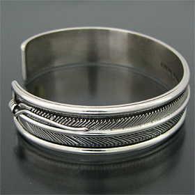 | NAVAJO/ナバホ族のアーティスト Harvey Mace/ハーヴィー・メイスに制作を依頼したフェザーモチーフのバングルです。 スタイリッシュな作品に仕上がっている、リバーメールのオリジナルデザインで制作して頂きました。 フォルムはフェザーの芯からはじまり、フェザーの形で終わるように仕上げられています。 流行に左右されないすっきりとしたシンプルなデザイン、主張しすぎないフェザーの柔らかさが大変魅力的な作品です。 ※サイズは多少変更が可能です。 | ||