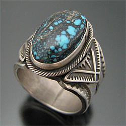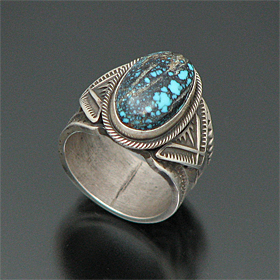 | 賞も獲得しているNAVAJO/ナバホ族の大人気アーティスト Gary Reeves/ゲーリー・リーブスが制作したリングです。 ゲーリー・リーブスが得意とするスタンプワークが巧みに施されており、ボリュームのあるチャイニーズ(ターコイズ)が使用されています! ゲーリー・リーブスが制作するベーシックなデザインですが、シルバーはマットな仕上げで、チャイニーズターコイズ全体にウェブが入っており、とても美しく、よりスタンプを引き立てています! スタンプワークで用いられる『たがね』は、たくさんの種類と数あり、一つ一つ組み合わせ方が異なるので、彼の作品には全く同じ模様と言うものが存在しないと言われています。 | ||