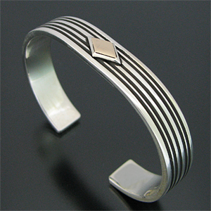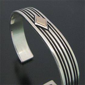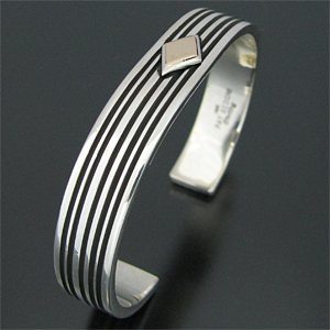 | NAVAJO/ナバホ族の女性アーティスト Patricia Bedonie/パトリシア・べドニーに制作依頼をしたバングルです。 シンプルにラインを入れて頂いた、リバーメールのオリジナルデザインです。センターには14K&シルバーを組み合わせた、ダブルダイヤモンドになっています。 シンプルですが、コントラストが際立つ作品に仕上がりました。 サイズ調整も可能ですので、お気軽にご相談ください。 | ||