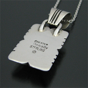 | NAVAJO/ナバホ族のアーティスト Chester Benally/チェスター・ベナリーに制作を依頼をしたネックレスです。 シルバーの板で仕切りを作り、その枠の中へターコイズやシェル、コーラル等の石や貝殻等を細かくカットした物をはめ込んでデザインを作っていく【チャンネルインレイ】を用いて制作されています。 独自のカット技術で、立体感のあるフォルムに仕上げられており、美しさと芸術性を兼ね備えている作品です。 | ||