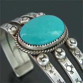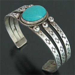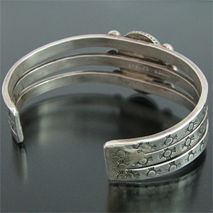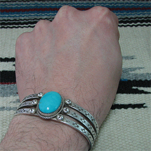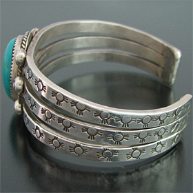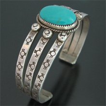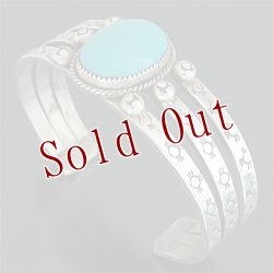 | TAOS/タオス族のアーティスト Sonny Spruce/ソニー・スプルースに制作を依頼したバングルです。 大胆にスリーピングビューティー(ターコイズ)が使用されている、ソニー・スプルースの代表的スタイルの作品です。 3本のスクエアワイヤーには、それぞれスタンプワークが施されており、素朴な風合いながらもしっかりと自身のスタイルが表現されています。 ダイナミックな作品ですが、着けた時の納まり具合は格別です。 ※サイズは多少変更が出来ますので、お気軽にお問い合わせください。 | ||