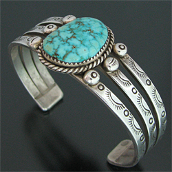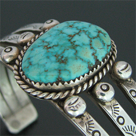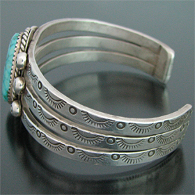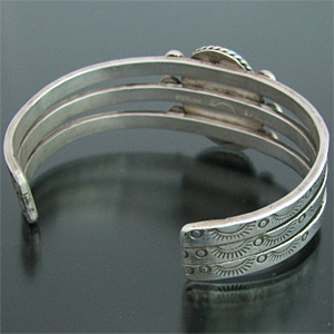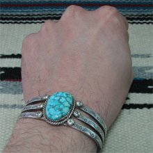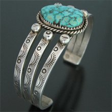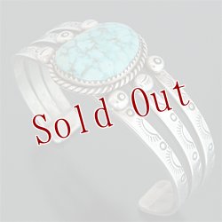 | TAOS/タオス族のアーティスト Sonny Spruce/ソニー・スプルースに制作を依頼したバングルです。 大胆にキングマン(ターコイズ)が使用されている、ソニー・スプルースの代表的スタイルの作品です。 3本のスクエアワイヤーには、それぞれスタンプワークが施されており、素朴な風合いながらもしっかりと自身のスタイルが表現されています。 ダイナミックな作品ですが、着けた時の納まり具合は格別です。 ※サイズは多少変更が出来ますので、お気軽にお問い合わせください。 | ||