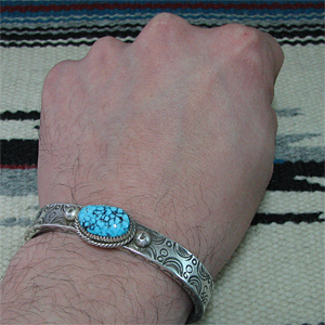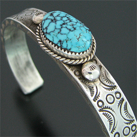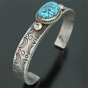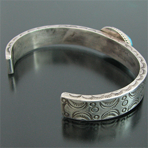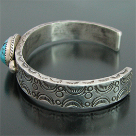 | TAOS/タオス族のアーティスト Sonny Spruce/ソニー・スプルースに制作を依頼したバングルです。 大胆にキングマン(ターコイズ)が使用されている、ソニー・スプルースの代表的スタイルの作品です。 厚みのあるスクエアワイヤーには、スタンプが全面に施されており、素朴な風合いながらもしっかりと自身のスタイルが表現されています。 細身ですが、着け応えのあるしっかりとした重厚感を感じ取って頂けます。 | ||