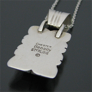 | NAVAJO/ナバホ族のアーティスト Chester Benally/チェスター・ベナリーに制作を依頼をしたネックレスです。 シルバーの板で仕切りを作り、その枠の中へターコイズやシェル、コーラル等の石や貝殻等を細かくカットした物をはめ込んでデザインを作っていく【チャンネルインレイ】を用いて制作されています。 独自のカット技術で、立体感のあるフォルムに仕上げられており、美しさと芸術性を兼ね備えている作品です。 | ||