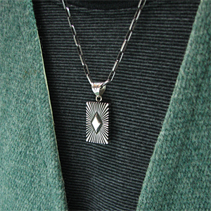 | NAVAJO/ナバホ族の女性アーティスト Patricia Bedonie/パトリシア・べドニーに制作依頼をしたペンダントです。 中心から外側に向かって大きく広がるサンバースト(太陽光線)をイメージした代表的作品です。 厚みのあるスクエアワイヤーを用いて、深いスタンプによってもたらされる凹凸からは、力強さが伝わってきます。 スタイリッシュなデザインは服装を選ばず着用して頂けます。また、チェーンはシルバー・レザーどちらでも合いますので、シーズンによって使い分けて頂く事も可能です。 | ||