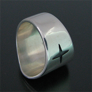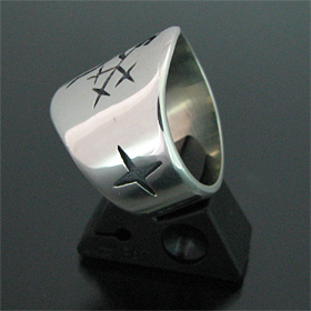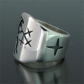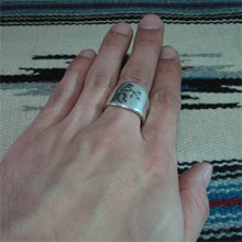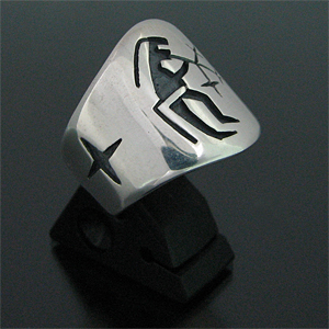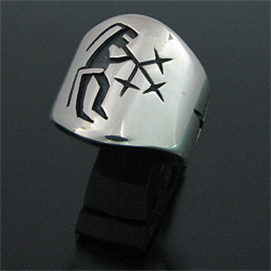 | HOPI/ホピ族のアーティスト Ricky Coochwytewa/リッキー・クーチュワイテワに制作を依頼をしたリングです。 オーバーレイ技法を用いて、偉大な父親であるヴィクターから継承されているスターブロワーズ(天国で星を生み出す者)がデザインされています。 両サイドには新たに星が生まれている様子がデザインされており、しっかりとした着け心地をお楽しみ頂ける作品です。 サイズ直しはデザイン、刻印に影響なく可能です。 | ||