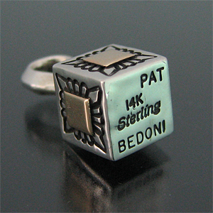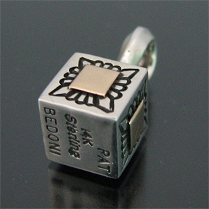 | NAVAJO/ナバホ族の女性アーティスト Patricia Bedonie/パトリシア・べドニーに制作依頼をしたペンダントです。 スモールサイズのキューブ型です。サンバーストのデザインが4面、それぞれ中央に14Kが施されています。 今回はRIVER MAILオリジナルのフックタイプで制作して頂きました。 シンプルで着けやすいサイズ感、男女問わずスタイリングをお楽しみ頂けます。 | ||