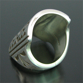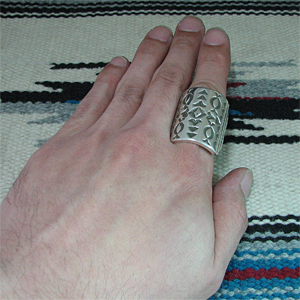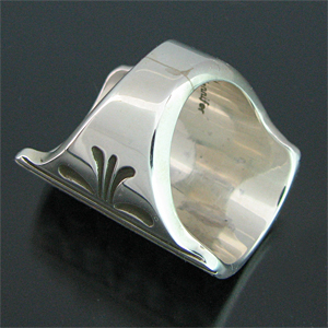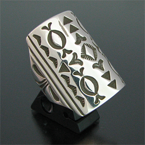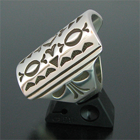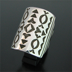 | NAVAJO/ナバホ族の女性アーティスト Jennifer Curtis/ジェニファー・カーティスに制作を依頼をしたリングです。 シールドをイメージした迫力のある作品に仕上がりました。分厚いシルバープレートに奥深いスタンプ、力強さと共にその正確なスタンプの技術がしっかりと表現されています。 指に沿った柔らかいフォルムは着けた時のバランスが良く、見た目以上にその美しさを感じ取って頂けます。 | ||