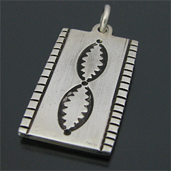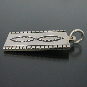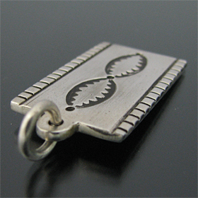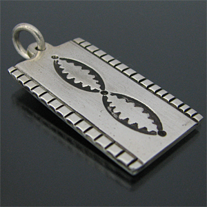 | NAVAJO/ナバホ族のアーティスト Darryl Begay/ダリル・ビゲイに制作を依頼したペンダントです。 銀の純度90%の1ドルモーガンコインを用いています。簡素なでデザインですが、スタンプは充分すぎる位に深く打たれています。 スタイリングのしやすさを考えたリバーメールの別注になります。 チェーンはホピチェーン、レザーネックレスでも相性良く着けていただけます。 | ||