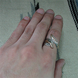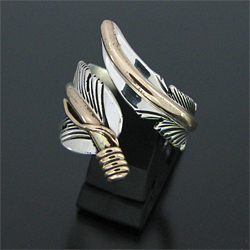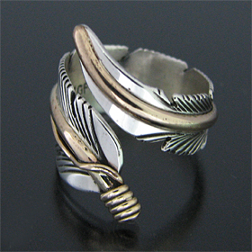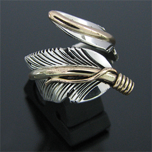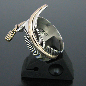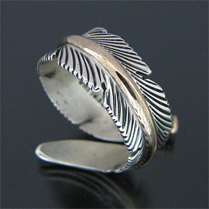 | NAVAJO/ナバホ族のアーティスト Harvey Mace/ハーヴィー・メイスに制作を依頼したリングです。 躍動感のあるフェザーモチーフのリングは、指を包み込むようなデザインに仕上がっています。 センターラインには12KGF(12金張り)が施されています。 美しい曲線と共にフェザーがしっかりとデザインされていますので、どなたでもお楽しみ頂けるリングです。 | ||