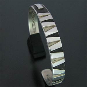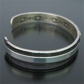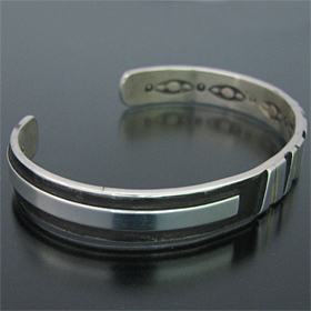| NAVAJO/ナバホ族のアーティスト Michael Roanhorse/マイケル・ロアンホースに制作を依頼したバングルです。 現代的デザインを手掛ける作家ですが、手作りの良さを感じるバングルです。バックスタンプが入っており、作家の拘りが垣間見える作品に仕上がっています。 独創性のあるデザインですが、エンドに向けて伸びるラインは目を表しており、放射線状のラインはナバホの髪、燻は肌の色を表現しています。 黒と銀のコントラストが印象的なバングルです。 | ||