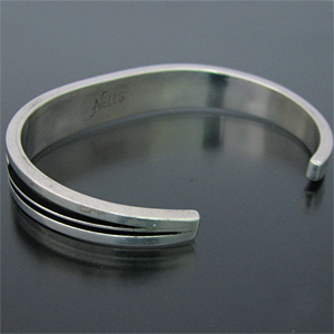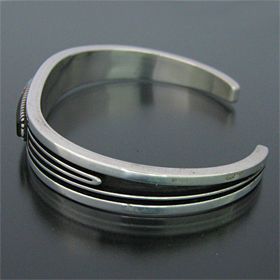 | NAVAJO/ナバホ族のアーティスト Albert Nells/アルバート・ネルスに制作を依頼したバングルです。 ベゼル部分をプレーンから凹凸のある物にして頂きました。石はジェット主体に組合わせて頂き、変わらず美しいラインに鏡面仕上げとのコントラストが際立つ作品に仕上がっています。 テーパーになっているため見た目がスタイリッシュで、着け心地の良いバングルです。 | ||