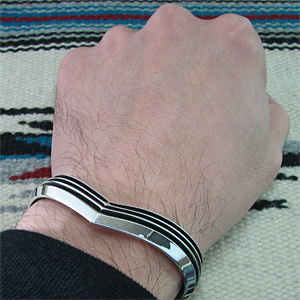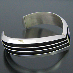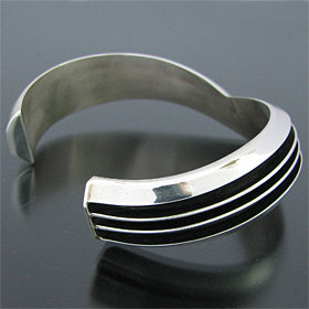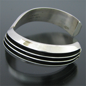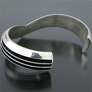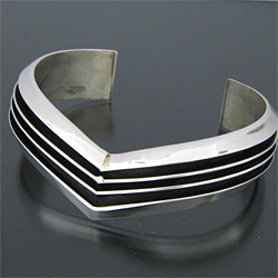 | NAVAJO/ナバホ族のアーティスト Tom Hawkが制作したV字型のバングルです。 銀と黒のコントラストが際立つシンプルでスタイルを問わない作品です。 独特のフォルムが印象的で、派手さはありませんがどなたでもお楽しみただけるバングルです。 | ||
