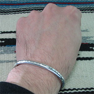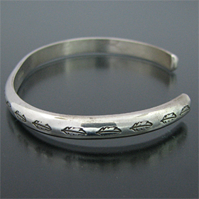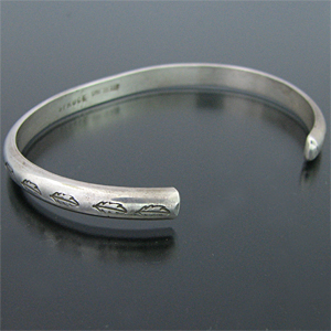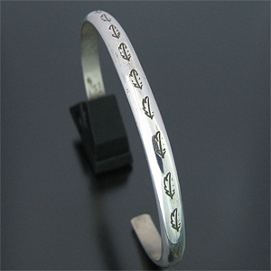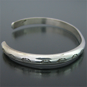 | TAOS/タオス族のアーティスト Sonny Spruce/ソニー・スプルースに制作を依頼したバングルです。 約2mm厚のハーフラウンドワイヤーに、フェザーのスタンプワークが施されています。 簡素なデザインですが、シンプルでどんなスタイルでも合わすことが可能で、単体でも他のバングルとの重ね着けでも相性良く着けることができます。 | ||