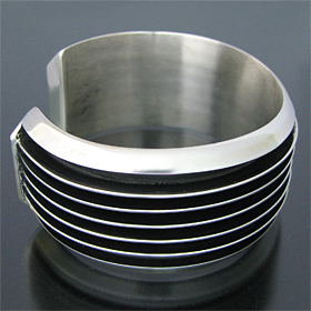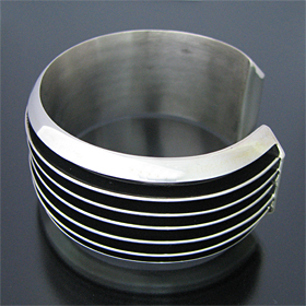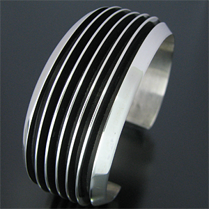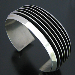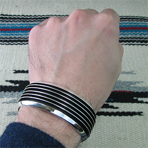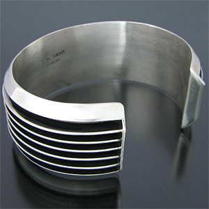 | NAVAJO/ナバホ族のアーティスト Tom Hawkが制作した5ラインのバングルです。 銀と黒のコントラストが際立つ、シンプルでスタイルを問わない作品です。 約26mm幅の存在感抜群のサイズで、しっかりとした重量を感じていただけます。 美しいラインが印象的で、どなたでもお楽しみ頂けるワイルド感溢れるバングルです。 | ||