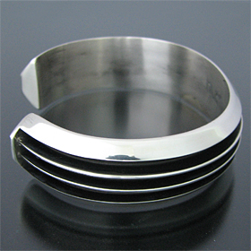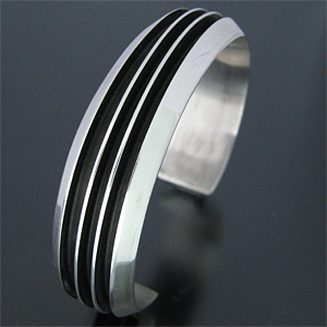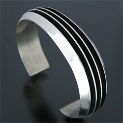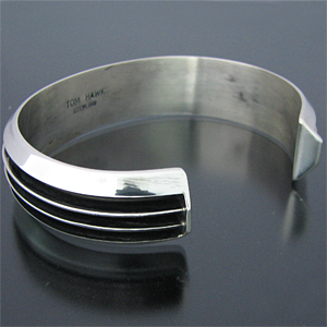 | NAVAJO/ナバホ族のアーティスト Tom Hawkが制作した2ラインのバングルです。 銀と黒のコントラストが際立つ、シンプルでスタイルを問わない作品です。 約16mm幅の着けやすサイズですが、見た目以上に重量があります。 美しいラインが印象的で、どなたでもお楽しみ頂けるバングルです。 | ||