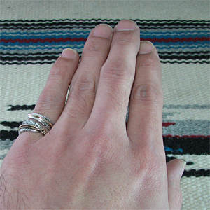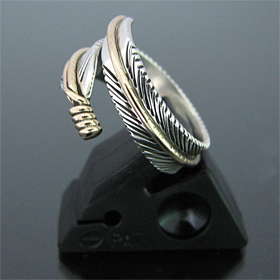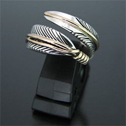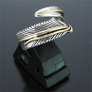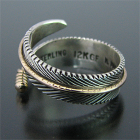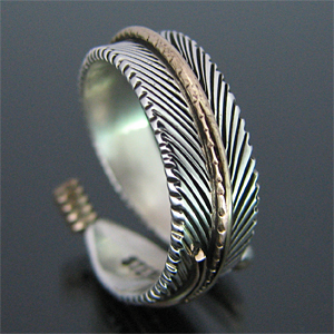 | NAVAJO/ナバホ族のアーティスト Harvey Mace/ハーヴィー・メイスに制作を依頼したリングです。 躍動感のあるフェザーモチーフのリングは、指を包み込むようなデザインに仕上がっています。 センターラインには12KGF(12金張り)が施されています。 美しい曲線と共にフェザーがしっかりとデザインされていますので、どなたでもお楽しみ頂けるリングです。 | ||