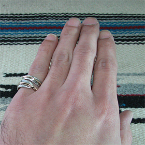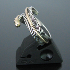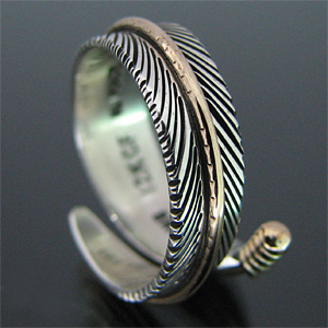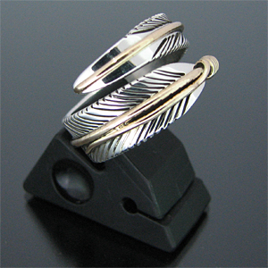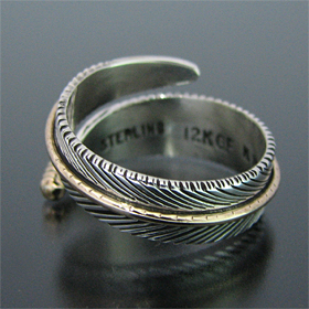 | NAVAJO/ナバホ族のアーティスト Harvey Mace/ハーヴィー・メイスに制作を依頼したリングです。 躍動感のあるフェザーモチーフのリングは、指を包み込むようなデザインに仕上がっています。 センターラインには12KGF(12金張り)が施されています。 美しい曲線と共にフェザーがしっかりとデザインされていますので、どなたでもお楽しみ頂けるリングです。 | ||