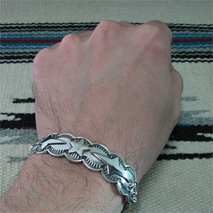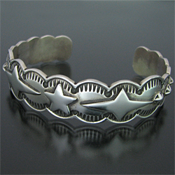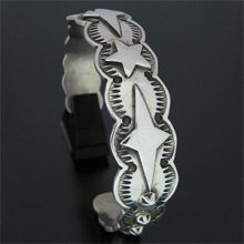 | NAVAJO/ナバホ族のアーティスト Sunshine Reeves/サンシャイン・リーブスに制作を依頼したバングルです。 全面にスタンプワークが施された重厚感のある作品です。 トップは5スターで、その両サイドに4スターをデザインして頂きました。また、鏡面仕上げによる美しい光沢が印象的なバングルです。 両サイドにはスターコンチョがアップリケされおり、ナバホの王道スタイルをお楽しみ頂けます。 | ||