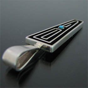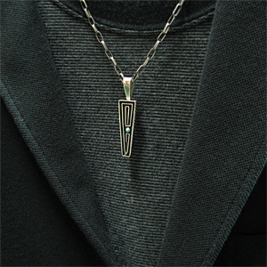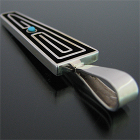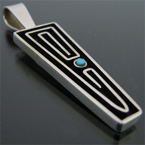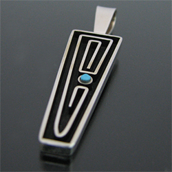 | NAVAJO/ナバホ族のアーティスト Albert Nells/アルバート・ネルスに制作を依頼をしたペンダントです。 よりシンプルな作品に仕上がりました。オーバーレイによる美しいラインはそのままで、ワンポイントにターコイズをセットして頂きました。 洗練された落ち着いたデザインはスタイルを選ばず、幅広いコーディネイトがお楽しみ頂ける作品です。 黒と銀のコントラストが印象的で、ターコイズがさりげなく主張されています。 | ||