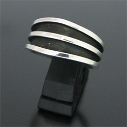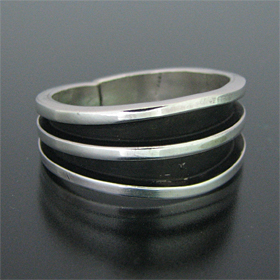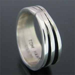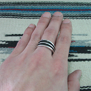 | NAVAJO/ナバホ族のアーティスト Tom Hawk/トム・ホークが制作した3ラインのリングです。 銀と黒のコントラストが際立つ、シンプルでスタイルを問わない作品です。 ボトム部分はテーパーが付いていますので細くなり、指の曲げ伸ばしも違和感なく心地よい装着感が感じられます。 美しいラインが印象的で、どなたでもお楽しみ頂けるリングです。 | ||
