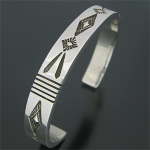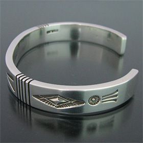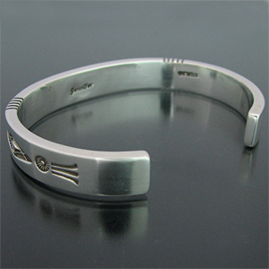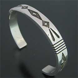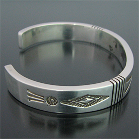 | NAVAJO/ナバホ族の女性アーティスト Jennifer Curtis/ジェニファー・カーティスに制作を依頼したバングルです。 10Gワイヤー(約3mm厚)にスタンプワークを施した作品です。 深く正確なスタンプワークは美しく、ヘビーゲージのため安定感のある着け心地です。 単体でも他のバングルとの重ね着けでも相性良く、どなたでもお楽しみ頂ける作品です。 | ||