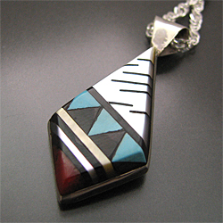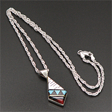 | ZUNI/ズニ族がインレイ技法を用いて制作したネックレスです。 カッティングを施した石をはめ込んで図柄を完成させる技法『インレイ』で制作されており、ズニ族ならではの抜群のカラーセンスに繊細さが兼ね備わっています。 美しいモザイク柄がとても印象的で、大胆な色使いに魅了されます。 女性らしい色合いとデザインに仕上がっていますので、女性の方への贈り物などにもいかがでしょうか? | ||