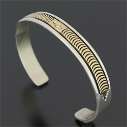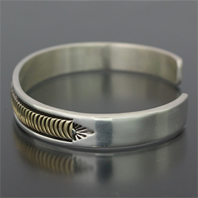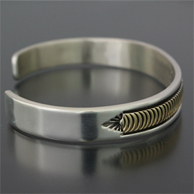| NAVAJO/ナバホ族のアーティスト Bruce Morgan/ブルース・モーガンに制作を依頼したバングルです。 シンプルながらも深く正確なスタンプワーク、こちらはRIVER MAIL別注のダイヤ/カーブデザインになります。 センターラインは14Kを使用しているため高級感があり、スタイルを選びませんので様々な場面でお使い頂けます。 単体でも他のバングルとの重ね着けにも相性良くお楽しみ頂けます。 | ||