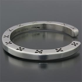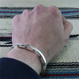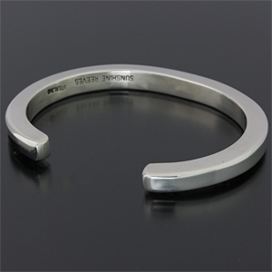 | NAVAJO/ナバホ族のアーティスト Sunshine Reeves/サンシャイン・リーブスに制作を依頼したバングルです。 角を落とす事によって丸みを持たせたRIVER MAIL別注です。側面のデザインはアロー/プレーンになります。 柔らかい着け心地に着用したときの存在感、厚みは約5.5mmと申し分なく、他のバングルと重ね着けされてもバランス良くスタイルをお楽しみ頂けます。 洗練されたシンプルさ、簡素な中に美を感じる作品です。 | ||