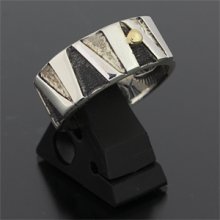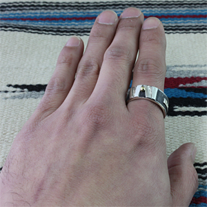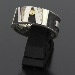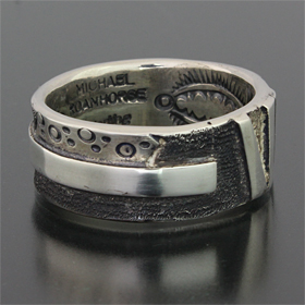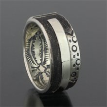 | NAVAJO/ナバホ族のアーティスト Michael Roanhorse/マイケル・ロアンホースに制作を依頼したリングです。 現代的デザインを手掛ける作家ですが、手作りの良さを感じます。 独創性のあるデザインですが、その背景にはそれぞれに意味があり、インディアンジュエリーの奥深さを感じます。 黒と銀のコントラストが印象的なリングです。 | ||